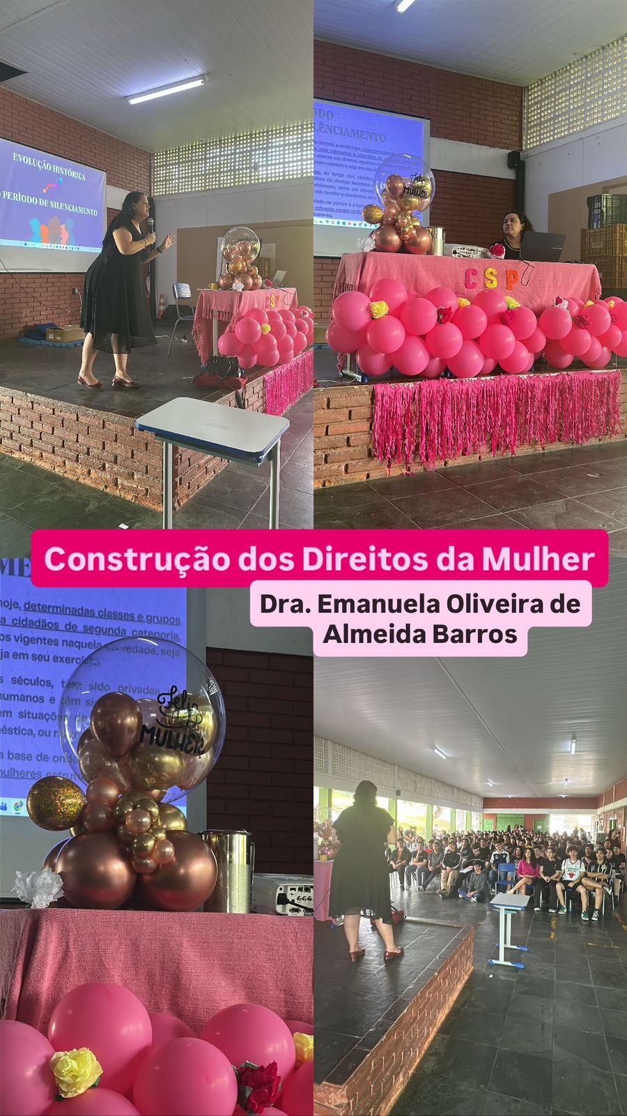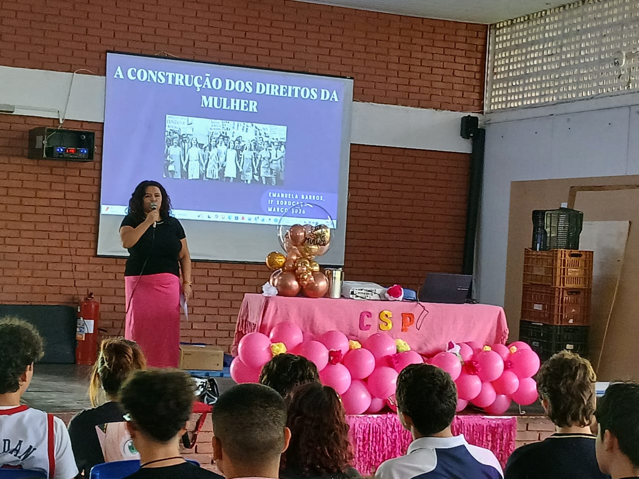 Em alusão ao Dia Internacional da Mulher 08 de março foi organizado pela Coordenadoria Sociopedagógica (CSP) do Campus Sorocaba o evento formativo com a palestra da Advogada Emanuela Barros sobre "A Construção dos Direitos da Mulher",que contou com apoio da Direção Geral e Educacional, da Docente de Arte Rosirene Abramo, dos estudantes das turmas do ensino médio integrado em Administração e Mecânica. O evento promoveu a reflexão dos estudantes em relação ao Feminismo,a valorização da Mulher e a equidade de direitos.